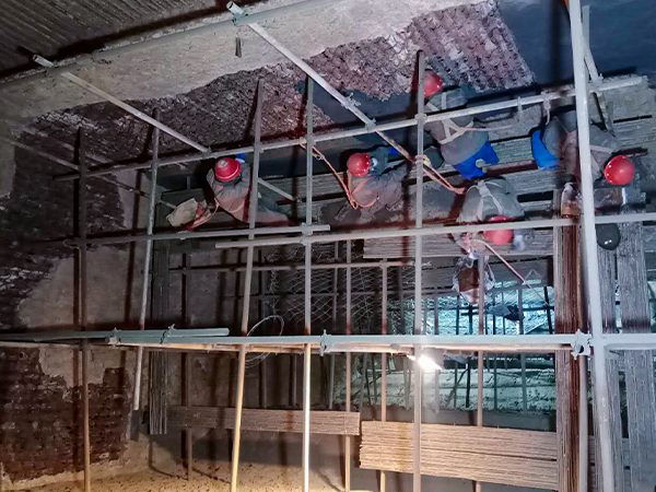 榮盛耐材施工人員正在施工 四川4x90循環(huán)流化床鍋爐內(nèi)襯維修現(xiàn)場(chǎng) 鍋爐內(nèi)襯不定形耐火材料施工效果 四川4x90循環(huán)流化床鍋爐···