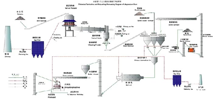 金屬鎂生產(chǎn)工藝-旋轉(zhuǎn)窯煅造白云石生產(chǎn)工藝:抓斗起重機將白云石送往皮帶運輸機,根據(jù)震動篩選出合格的金屬鎂,由大傾角帶送往預熱器頂端料倉。料倉里的白云石根據(jù)六根滑管進到預熱器,煅造中產(chǎn)生的約900℃熱煙氣與白云石在此傳熱。當白云石被加熱到800℃時,液壓推桿將石塊送至回轉(zhuǎn)窯尾端鍛練。鎂回轉(zhuǎn)窯的旋轉(zhuǎn)使石白云石受熱均勻,并逐步向窯頭方向移動。窯頭罩處安裝燒嘴,點燃溫度做到1250℃,以適應活力煅白對溫度的需求。熱煅燒白從窯頭掉入冷卻塔,與風機鼓入的二次空氣傳熱。氣體加熱至600℃左右,進到窯頭點燃,煅燒白冷卻至100℃以下,依據(jù)給料機對稱掉入鱗板輸送機,輸送至下一道工序。離去預熱器約260℃的廢氣,通過管道進到布袋除塵器,凈化廢氣,完成標準排出,進行煅造金屬鎂的整個生產(chǎn)過程。