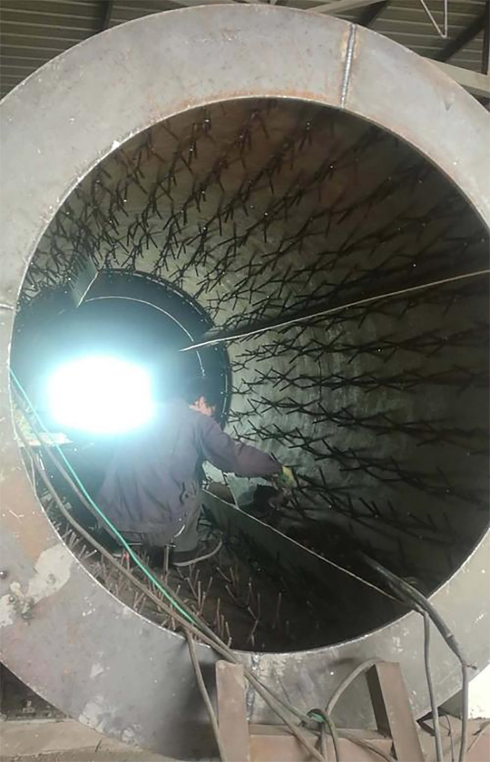 另外,部分回轉(zhuǎn)窯采用輕質(zhì)澆注料或者纖維板等作為隔材料,工作層采用重質(zhì)澆注料(金屬抓釘錨固)雙層澆注結(jié)構(gòu),可以合理控制回轉(zhuǎn)窯外壁溫度。該結(jié)構(gòu)采用金屬件把耐火材料和筒體連為一體,不存在耐火磚脫落問題,但是金屬件焊接質(zhì)量和澆注料中水份烘干排出是關鍵。