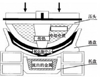 壓榨回收法的工作原理是將熱鋁灰從壓濾機(jī)上部裝入,對(duì)熱鋁灰施加靜壓或者動(dòng)壓,將熔融鋁擠壓出。例如SPM法、MADOC法、COMPAL法、Thepress法等,原理如圖2所示。壓頭施加壓力,爐渣內(nèi)的金屬受壓流向下層容器,在此期間鋁灰氧化迅速停止,形成的金屬殼將氧化物包裹起來(lái),這樣既可以控制灰塵,也能減少煙氣的排出,而熱量由循環(huán)冷卻水帶走,爐渣的溫度逐漸降低到450℃以下,防止氧化的二次發(fā)生。