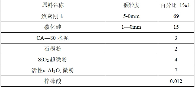 自20世紀(jì)70年代開始研制Al2O3—SiC—C質(zhì)澆注料,隨著不定形耐火材料技術(shù)進(jìn)步,開發(fā)了粘土結(jié)合、鋁酸鈣水泥結(jié)合、硅溶膠結(jié)合、ρ-Al2O3結(jié)合、磷酸二氫鋁結(jié)合等Al2O3—SiC—C質(zhì)澆注料。加上施工及維修等的技術(shù)進(jìn)步,又開發(fā)了免烘烤澆注料、快干型澆注料、自流型澆注料、環(huán)保型澆注料等。但始終都是屬于Al2O3—SiC—C質(zhì)澆注料。代表性的配料見表1。