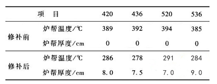 電解槽側(cè)部?jī)?nèi)襯破損部位修補(bǔ)前后爐幫溫度及爐幫厚度的測(cè)量對(duì)比分析結(jié)果見(jiàn)表2。