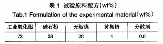 試驗(yàn)以工業(yè)氧化鋁、硅石粉為主要原料,外加無煙煤,以黃糊精為結(jié)合劑,另外加少量分散劑。試驗(yàn)基本配方如表1所示。其中工業(yè)氧化鋁的相組成為:70-80%為γ-Al2O3,5-10%為α-Al2O3,5-10%為三水鋁石。