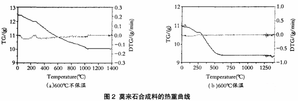 由于DSC-TG分析的測量用料量大多≤100mg,并且要磨成細(xì)粉。這種實(shí)驗(yàn)方法很難代表混合料實(shí)際的情況,且缺乏均勻性和代表性,從動力學(xué)上也不能反映澆注料加熱過程的實(shí)阮變化情況。目前對于尺寸和質(zhì)量大的試樣,只能通過試樣加熱前后質(zhì)量的變化來表征總的反應(yīng)情況。用整體的樣塊大試樣加熱更接近真實(shí)。大試樣熱重儀對烘干后的試樣進(jìn)行熱重分析,測定室溫至1400℃過程中重量的變化,結(jié)果如圖2(a)所示。由圖可知,在連續(xù)加熱不保溫的情況下,質(zhì)量一直到1100℃才保持穩(wěn)定。根據(jù)DSC-TG及大試樣熱重分析結(jié)果,混合料在1200℃以上均可生成莫來石,只是莫來石的生成速度和轉(zhuǎn)化率隨溫度不同而會有所差異。本工作的主要目的是合成具有微孔結(jié)構(gòu)的莫來石骨料,既要求合成料有一定的氣孔率,孔徑小、體密輕,又要求其強(qiáng)度高,即要有理想的莫來石轉(zhuǎn)化率,同時(shí)還要兼顧煅燒設(shè)備投資、生產(chǎn)成本等,因此摸索理想熱處理制度對本工作而言至關(guān)重要。