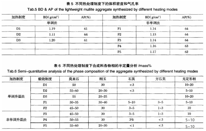 從表5可看出,在一種單調(diào)式升溫方式下,隨著保溫時(shí)間的延長,合成輕質(zhì)莫來石骨料的體枳密度呈現(xiàn)先升后降的趨勢,顯氣孔率呈現(xiàn)先降后升的趨勢,這與保溫過程中莫來石化程度相關(guān)。